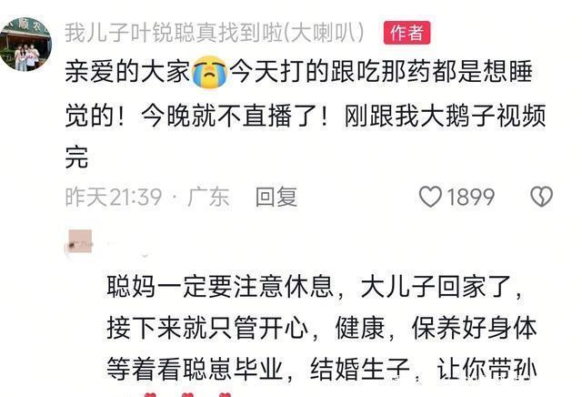 叶锐聪的妈妈大喇叭到外面吃早餐,她说今天要吃一个本地早餐,网友们以为她要给粉丝们介绍早餐,没想到她醉翁之意不在酒。       叶锐聪的爸爸全程没说一句话,却被网友们夸赞了。       大喇叭自从儿子回家以后基本每天晚上直播,她那豪爽大气的性格和幽默风趣的语言让粉丝们念念不忘,几天时间已经涨�万了!       昨天晚上,大喇叭因为吃了药打了针,身体实在扛不住了,就没直播。粉丝们也都理解,她的身体需要需要休息。       今天,大喇叭满血复活,一大早和老公到早餐店吃饭。       她坐在车上,告诉大家,今天要吃一个他们当地的本地早餐,一种非常好吃的早餐。       既然是她们本地的早餐,那一定是外地没有的,网友们都很期待大喇叭到底会吃什么早餐呢?特别是外地的网友,开始睁大眼睛期待着她给大家介绍美食。       大喇叭来到了一家看上去很小很简陋的早餐店,还没走进去,在门外就大声对着老板和老板娘说:很好吃的啊,我帮你出出名。       “我帮你出名”这句话,就是我大喇叭到你这里来吃早餐了,我粉丝多,吃饭要拍视频,粉丝们看了都会来吃的。       老板娘说:好,谢谢你啊!       老板做着饭,大喇叭站在旁边开始说话,第一句就是这些天她已经说了无数遍的话:你知不知道我儿子找到了?       孙海洋说:自从叶锐聪回来以后,大喇叭就已经疯了,他大概要疯一个月才能罢休。       现在看看,确实这样,大喇叭带儿子去拍照片的时候问店员:你知不知道我儿子找到了?       去奶茶店的时候也要问店员:我儿子真的找到了,回来了,你知道吗?       粉丝们都要笑翻了,一�岁的中年女人,这是要返老还童了吗?像一个三岁小孩一样,到哪里都要说儿子回来了。       老板和老板娘都回答:我们知道你的儿子找到了,哇,好厉害啊,恭喜你啊,好激动啊!       大喇叭这时候心里比蜜还甜,所有人都知道她儿子叶锐聪找到了,她所有的烦恼都烟消云散了!       大喇叭又说起自己那天说要订饼,并不是嫁女儿,而是儿子回来了,订了饼每人送一袋,还有巧克力,让大家吃了都开心。       大喇叭继续滔滔不绝的说:我告诉你们两个听,我昨天回来好像浑身不舒服那样,老是觉得好焦虑啊,感觉好像不是真的那样。他们以前老是说我和儿子没有缘分,没有做梦。昨天回来做梦梦到他打架打不赢别人,我说我死都要打赢他。       这些话把老板娘笑的前仰后合。       大喇叭又从大儿子说到小儿子:你也知道我的小儿子说话很拽的,讲话好拽的,所以我觉得好他好搞笑的。       大喇叭太健谈了,只要她在,就不会给别人说话的余地,都是她在说,而且说话的内容天马行空,从东到西,从大儿子说到小儿子,三句话不离儿子。       老板把早餐做好,端上桌,大喇叭不是赶快低头吃饭,而是拿出手机,找到大儿子的视频给老板娘看,边看边说:你知不知道他这个头发,他回来我给他修了三次,剪了三次,如果他胖点就和我小儿子很像的啦。       视频结束了,网友网友们也没有看到大喇叭口中的本地早餐是什么样的,大失所望!以为她会介绍一种很新奇的早餐给大家看,没想到全程都在炫耀她的儿子[捂脸]       大喇叭早餐都吃完了,网友们也没看到早餐的一个镜头,她似乎就是吃的一碗普普通通的面条。似乎在大喇叭心里,本地早餐有啥好说的,还是炫儿子更实在。       整个吃早餐的过程,叶锐聪的爸爸都在沉默,他静静的看着老婆炫耀儿子,不说一句话。要么默默的站在一旁,要么默默的低头吃饭。       但是网友们都感觉聪爸的沉默也是对老婆的爱。不管大喇叭做什么说什么,他都支持和赞许,从来不会反对,更不会扯后腿。       大喇叭出门找孩子的时候,聪爸在家好好做生意赚钱,把孩子们都照顾的很好。       大喇叭有病心情不好的时候,他会默默陪伴,支持她到广州看病拿药。       聪爸虽然话不多,却得到了网友的大力称赞       有人说聪爸爱老婆,是模范男人,三观正,懂得感恩,知道儿子回来与老婆的付出有很大的关系。       大喇叭性格外向爱说话,聪爸性格沉稳不张扬,儿子女儿懂事又孝顺,这样的一家人一定会越来越好[赞]